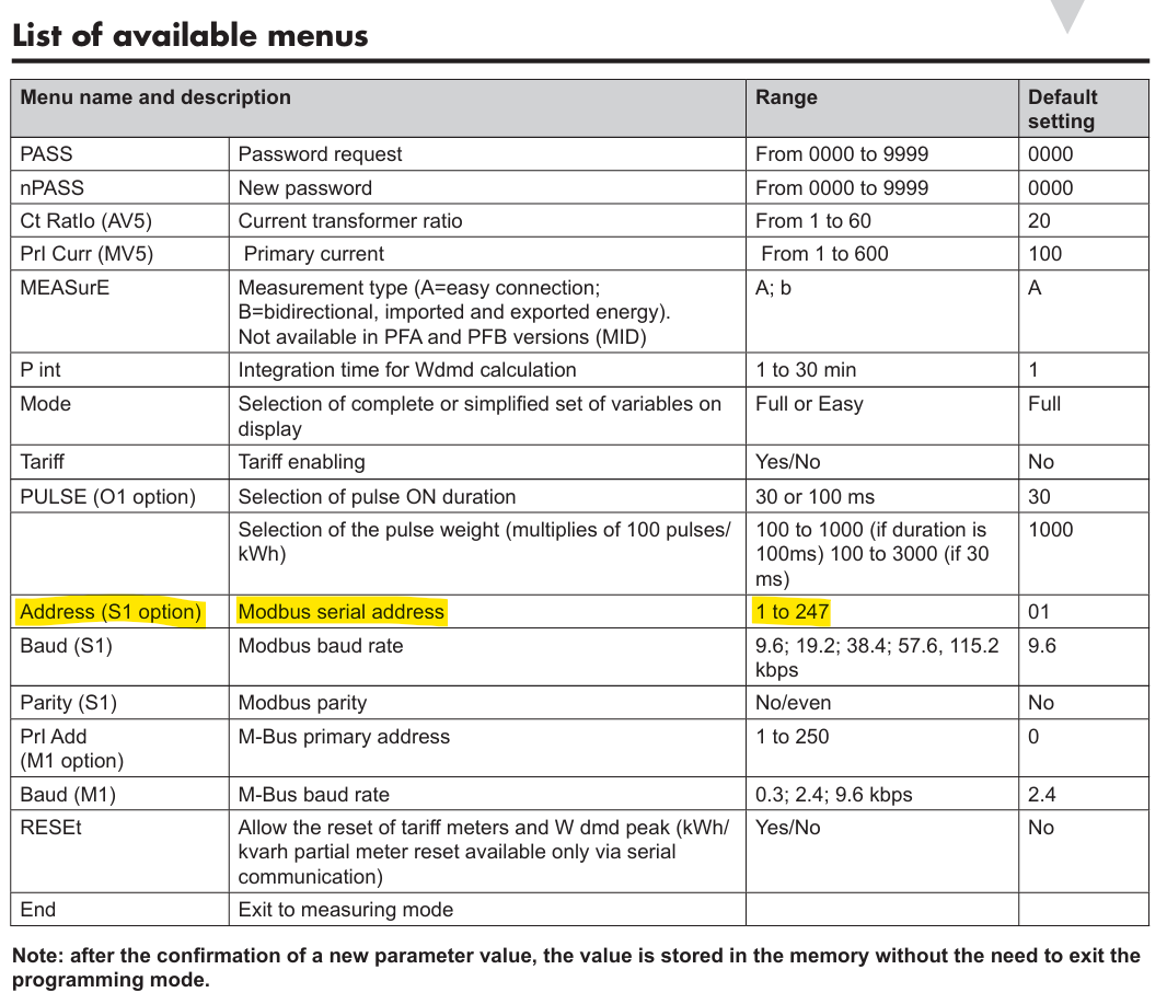Set the Modbus address through the power meter's “Address” configuration menu.