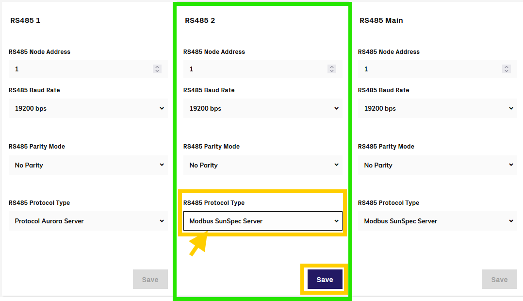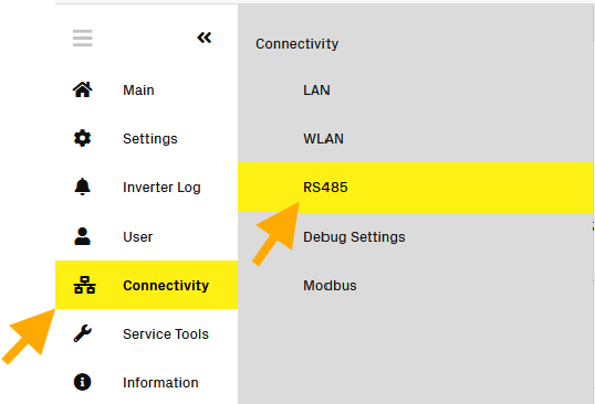 On the left side menu, go to the 'RS485' settings page: