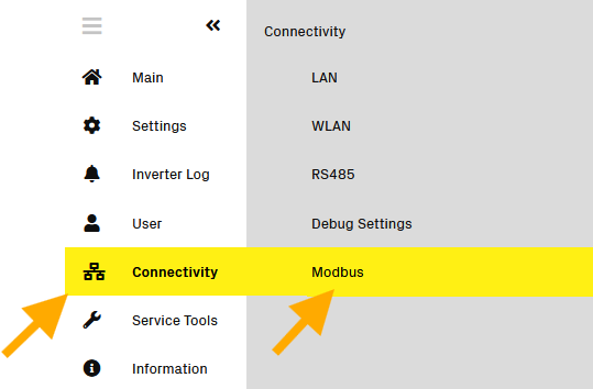 On the left side menu, go to the 'Modbus' settings page: