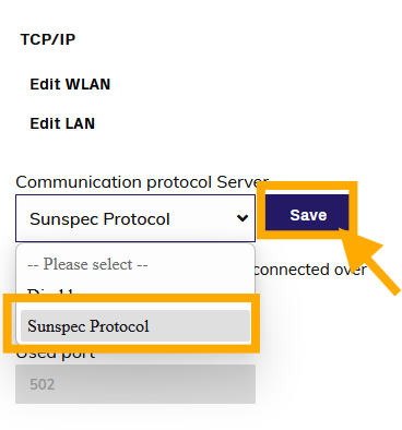 Ensure that the 'Communication protocol server' is set to 'Sunspec'. If Sunspec is not available, you can select 'Aurora Power One' as a protocol, but this will not support curtailment.