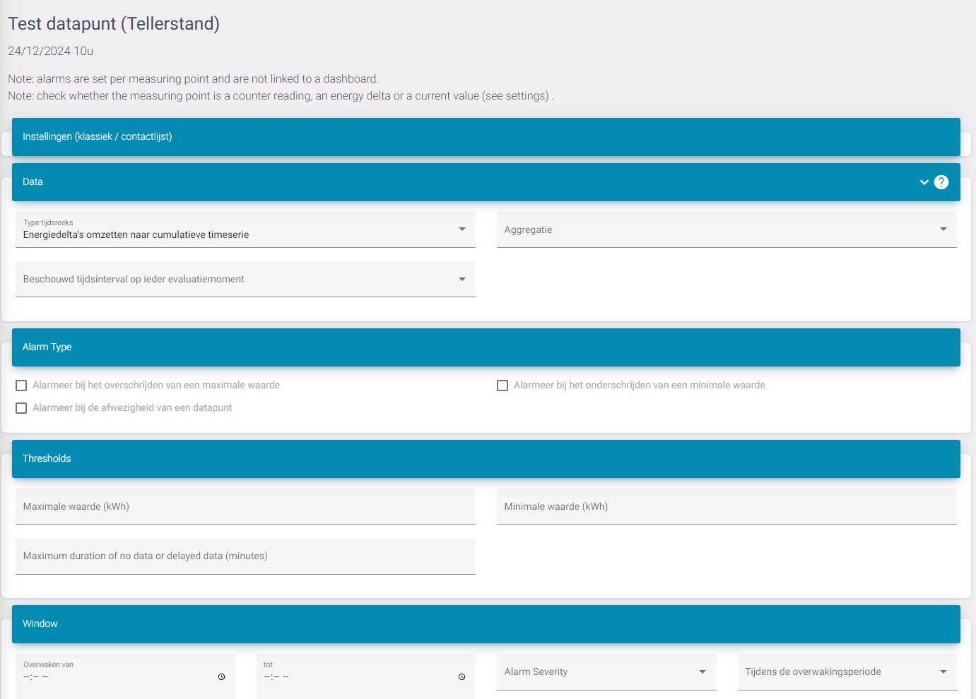 In this part you can say how the data is read, if you want real-time or averages and what interval. For example I want to see if the data has been under a certain threshold for the last 7 days. Then you can select 'Last 7 days' and configure how much the data can be for that period in the next part.